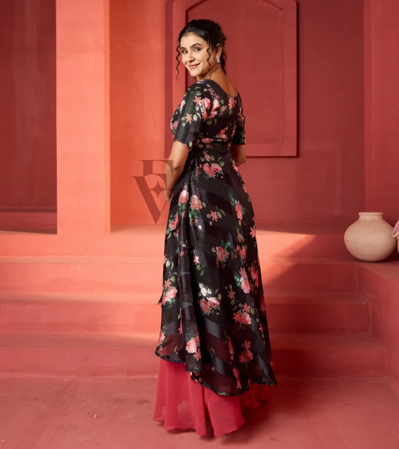 A flowy deep onion pink georgette plaza paired with a black printed georgette satin long coat