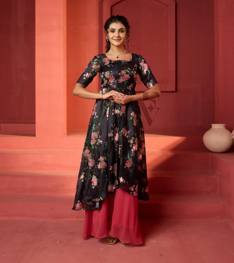 A flowy deep onion pink georgette plaza paired with a black printed georgette satin long coat. The round neckline with piping detail adds a refined touch, while the elbow sleeves enhance the struct...