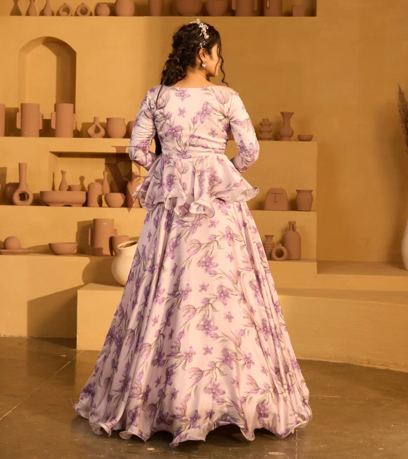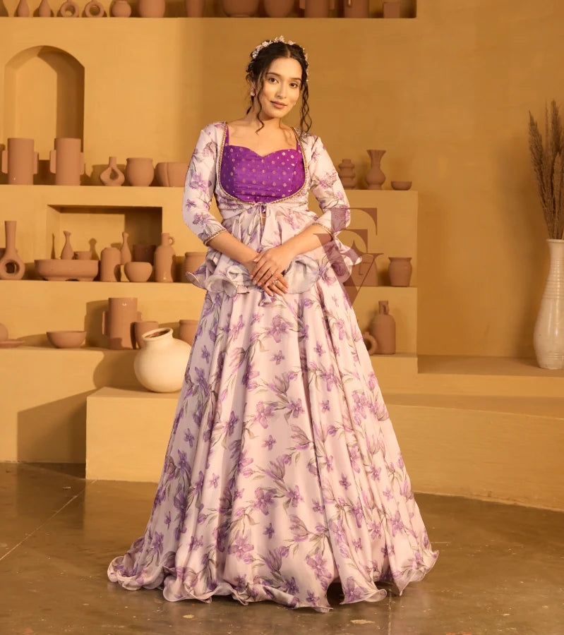 A lavender georgette satin skirt paired with a violet Banarasi silk blouse and a ruffled lavender georgette satin coat. The flared silhouette, intricate weaving, and delicate embellishments create ...