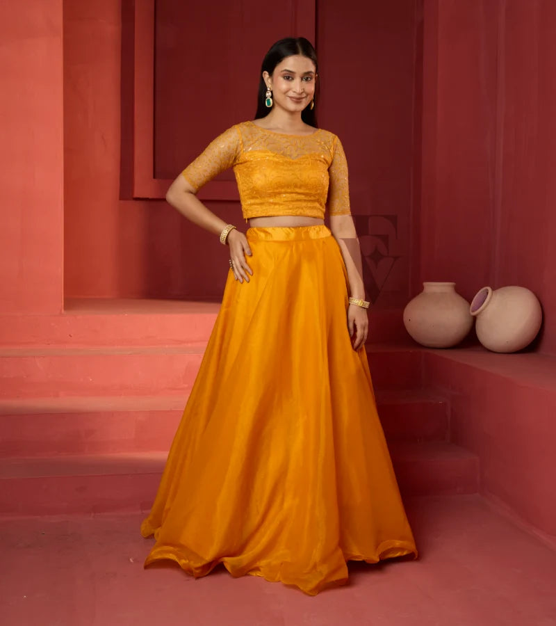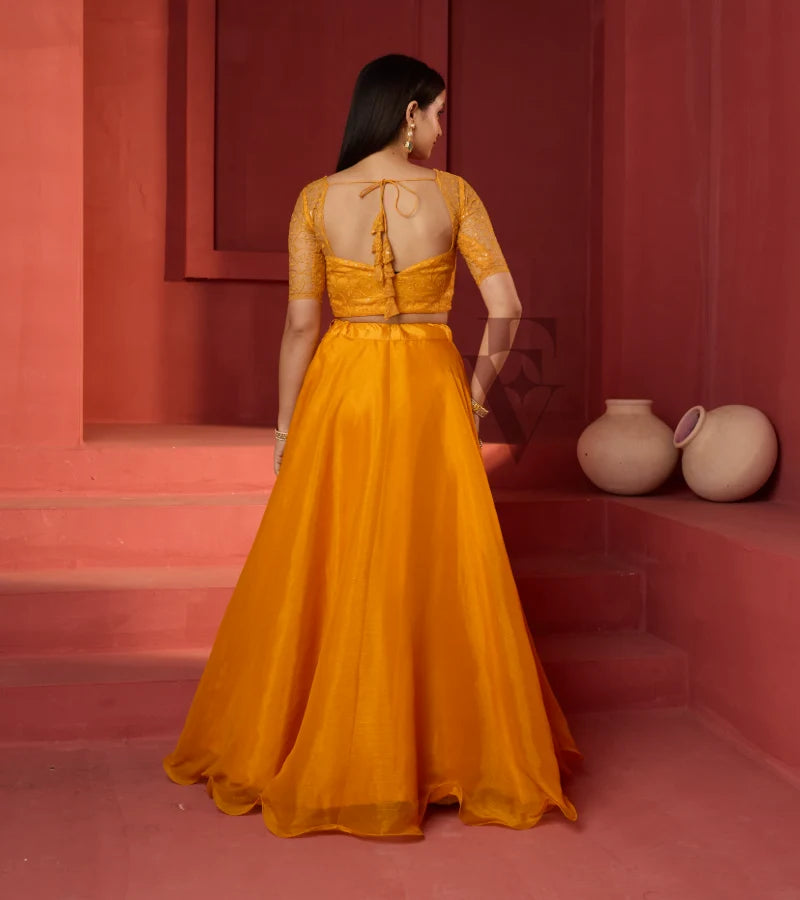 A vibrant yellow ensemble that exudes grace and elegance. The flowing flared skirt in luxurious Burberry silk offers a soft yet structured drape, while the princess-style blouse features delicate e...