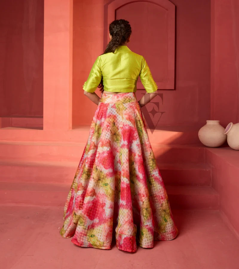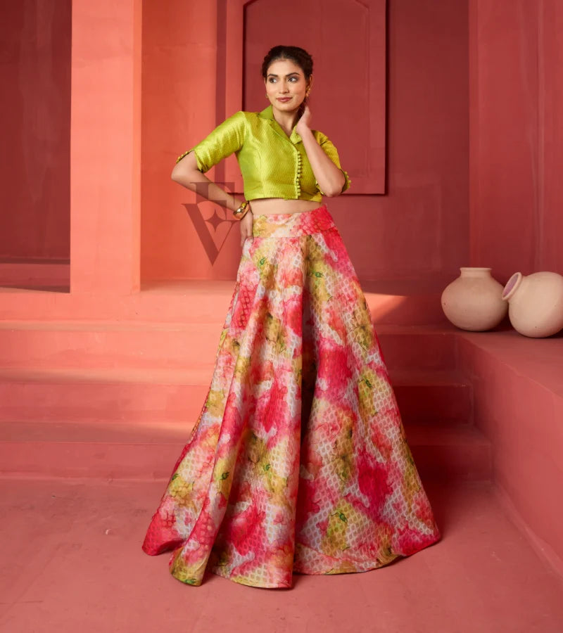 A striking combination of a multicoloured Banarasi-style flared Half Saree with a vibrant lime green silk blouse. The skirt showcases traditional weaving with a splash of modern dyeing techniques, ...