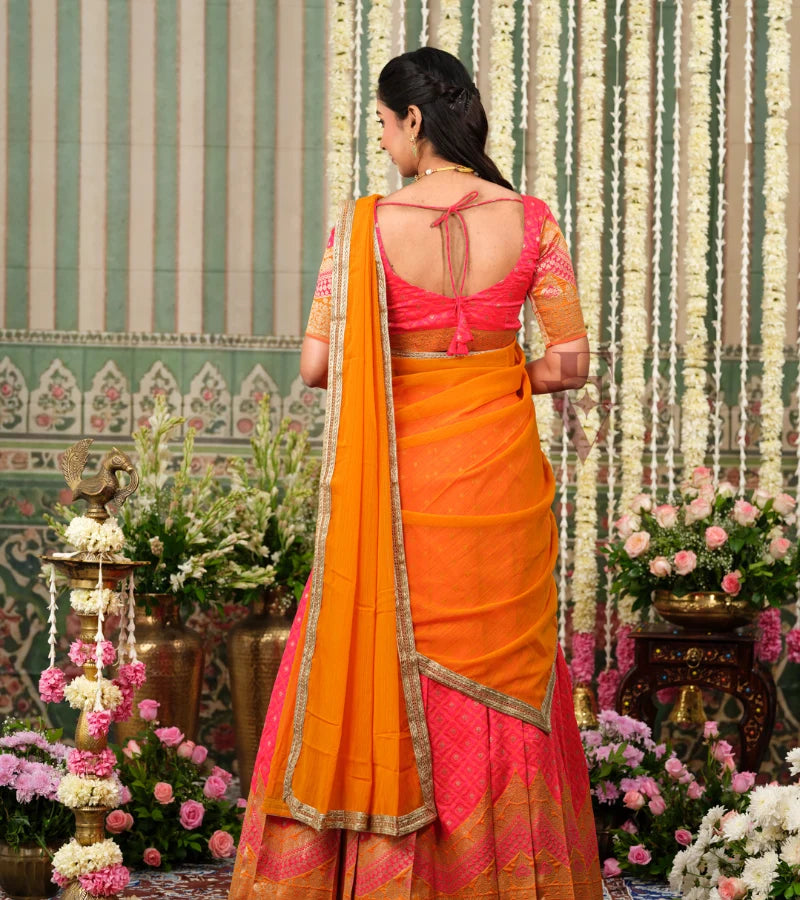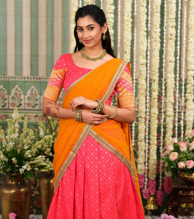 A beautifully woven Gajri pink Banarasi silk half saree that brings together grace and tradition. The rich patterns on the Half Saree and blouse give it a timeless charm, while the bright yellow dh...