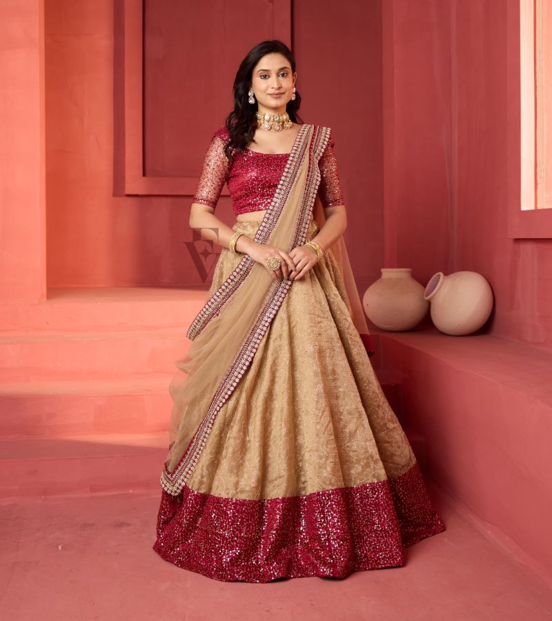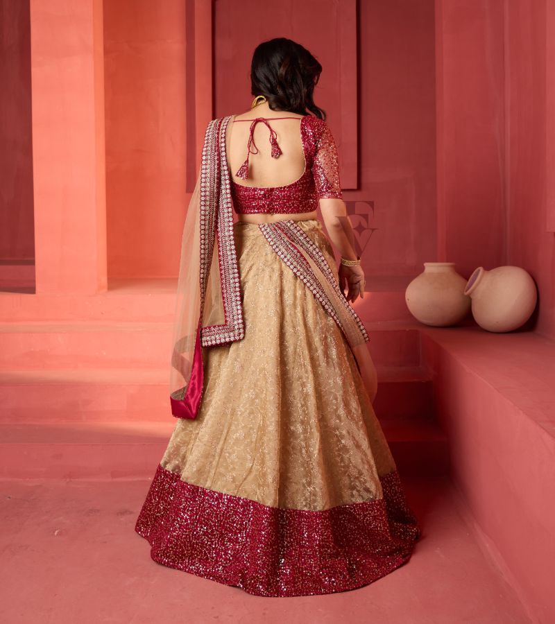 A luxurious Lehanga in beige and maroon hues, crafted from premium fabrics and adorned with intricate embroidery and sequin embellishments. The perfect blend of elegance and tradition, designed for...