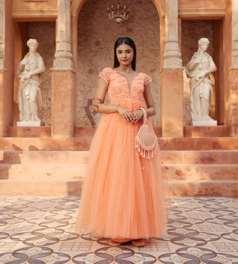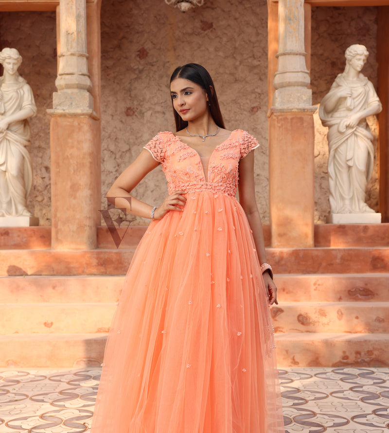 A beautiful coral orange flared gown crafted from premium soft net fabric. The gown features intricate handwork and applique patterns, adorned with beads, pearls, and thread embellishments, creatin...
