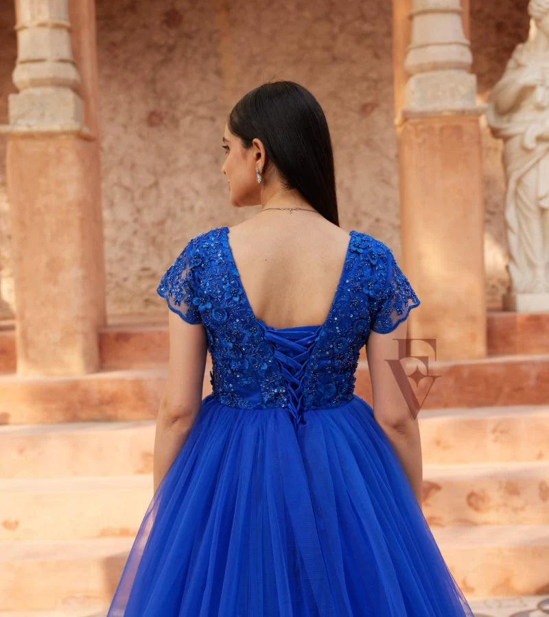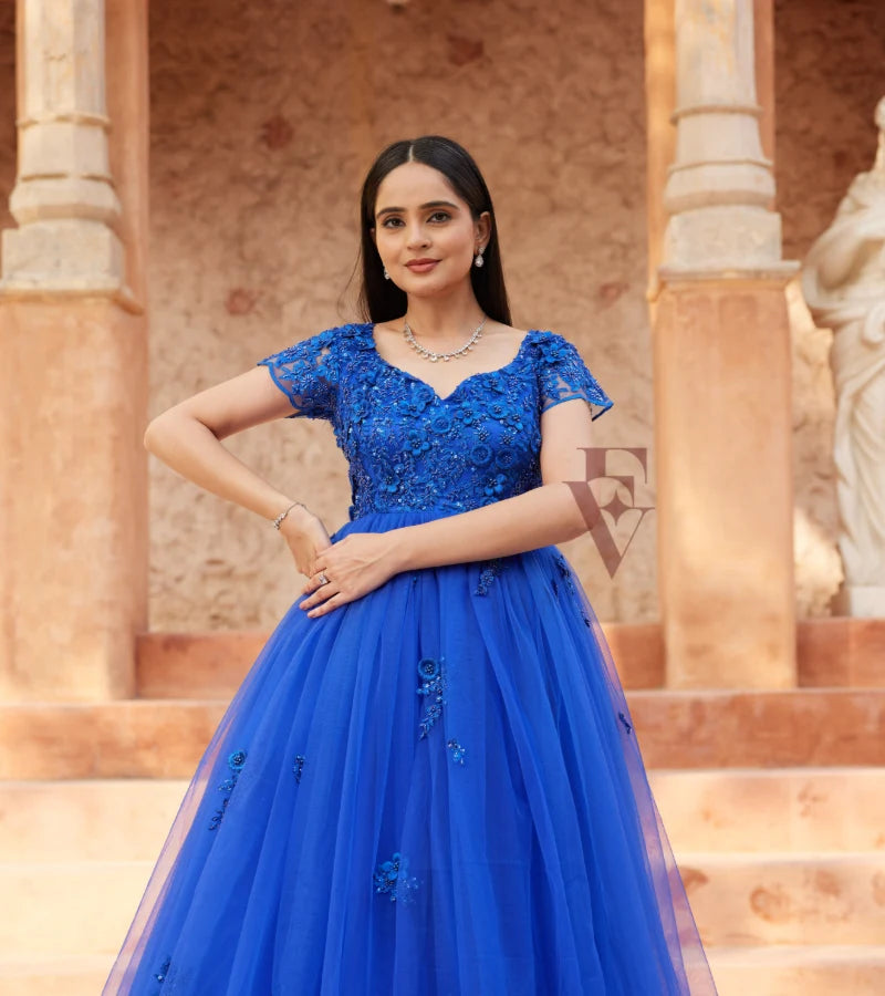 A gorgeous blue flared gown crafted from premium net fabric, designed to offer elegance and sophistication.