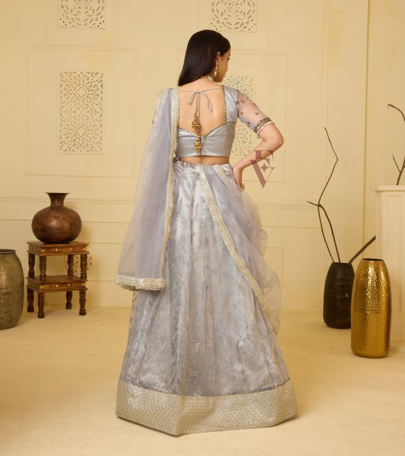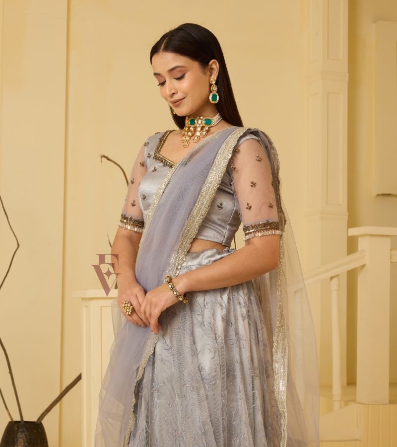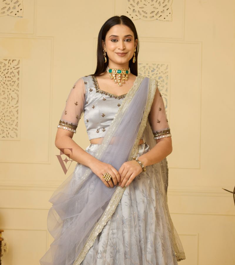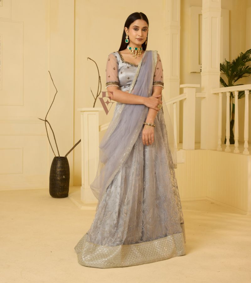 A sophisticated grey Lehanga set crafted from premium net fabric. The intricate embroidery and sequin embellishments elevate its charm, making it perfect for grand celebrations.