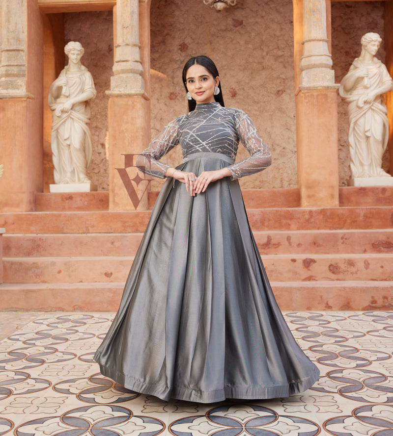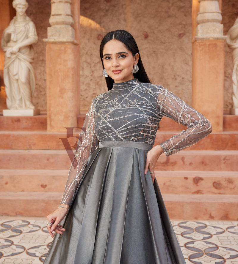 A gorgeous grey pleated flared gown crafted from a combination of premium soft net and SPIK georgette fabrics. This gown features intricate embroidery and is embellished with pearls, sequins, cutda...