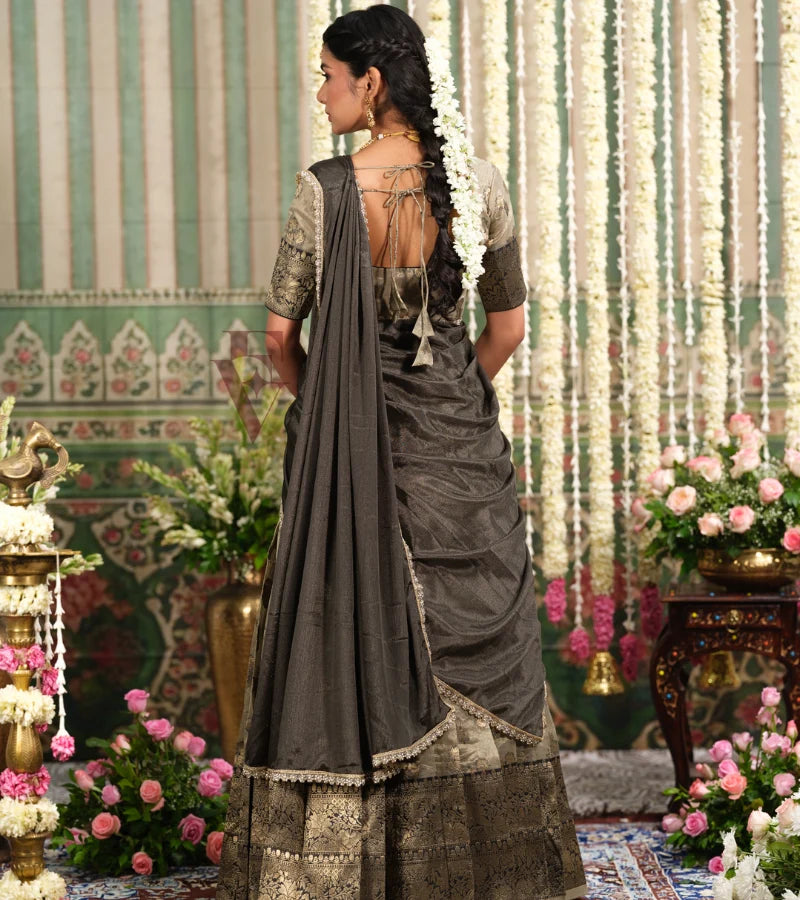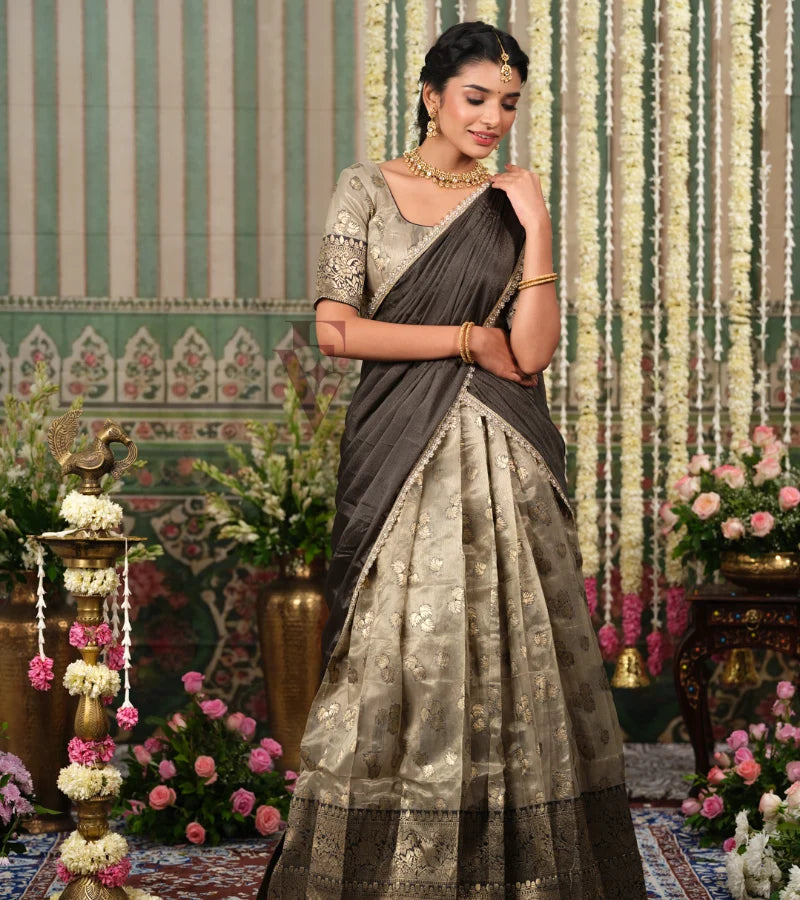 A luxurious golden and dark grey Tissue Banarasi outfit that exudes sophistication and elegance. The flowy skirt creates a graceful look, while the matching blouse enhances the outfit's charm. The ...