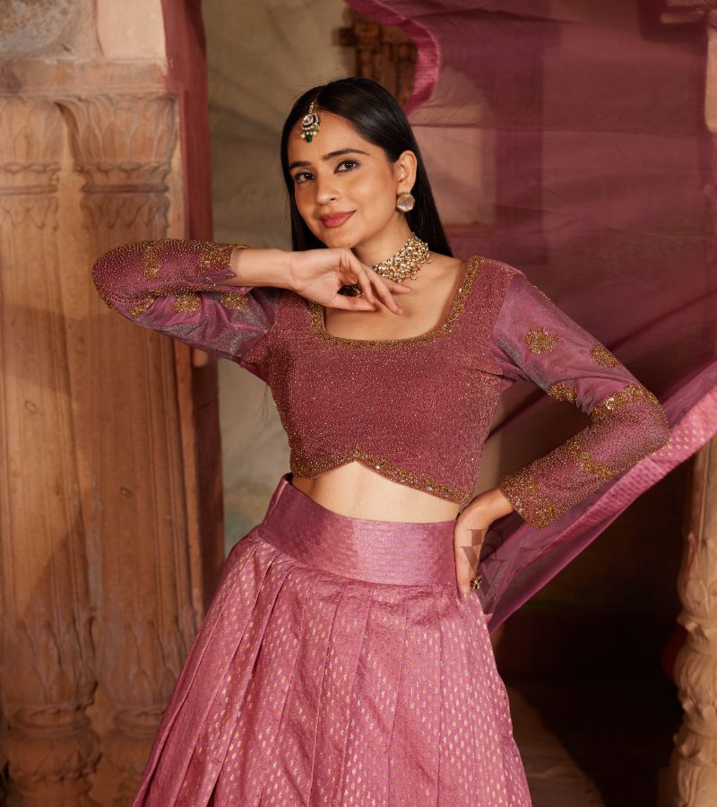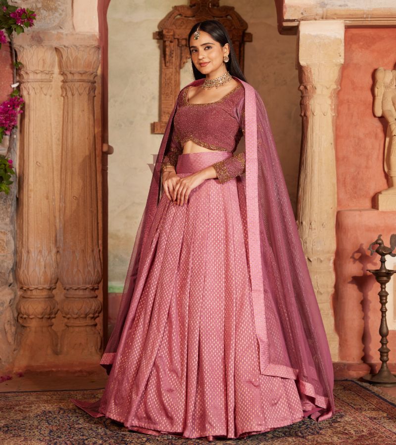 Mauve-pink lehenga with floral jacquard detailing for a stunning look.
