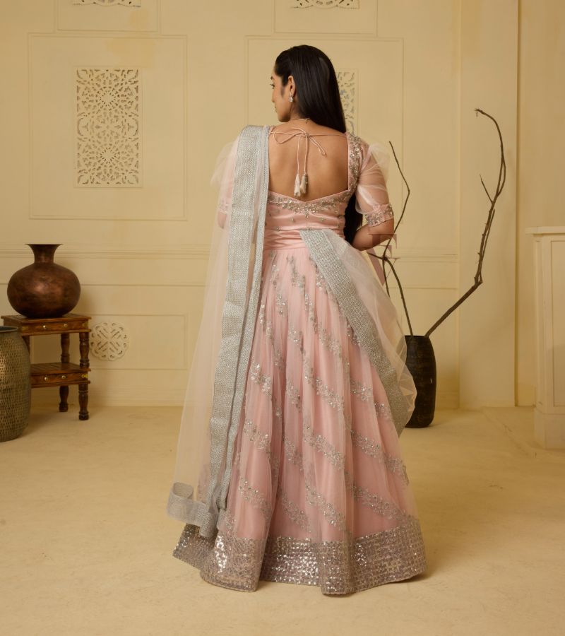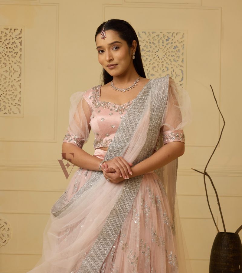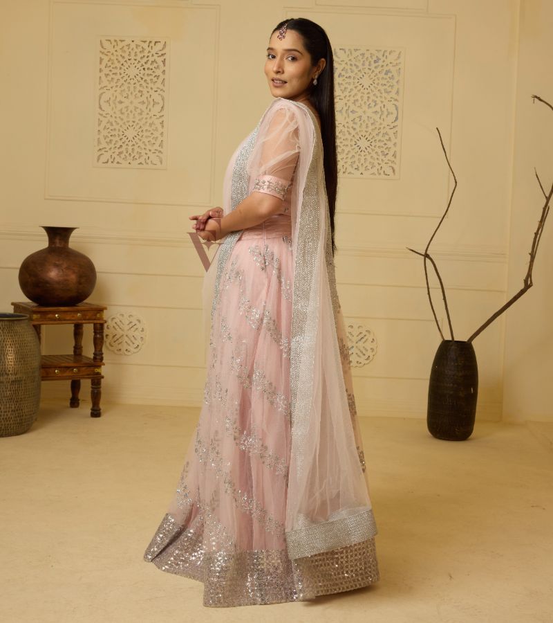 A soft and elegant mild pink Lehanga with delicate embellishments and embroidery. The layered border design enhances the overall appeal, while the fitted blouse and gracefully draped dupatta comple...