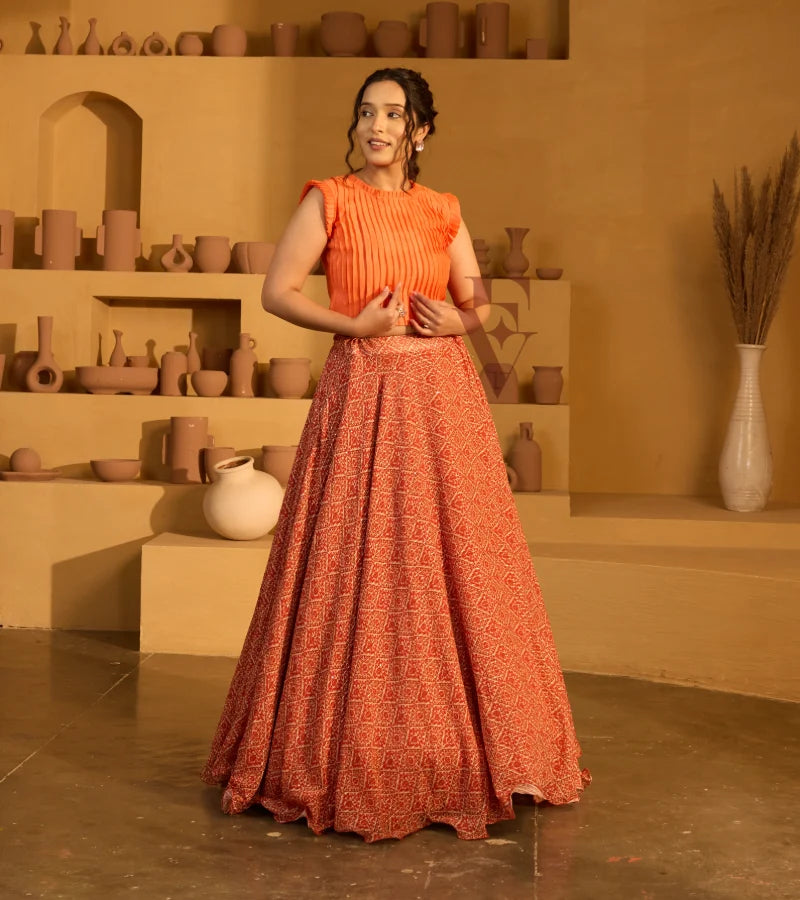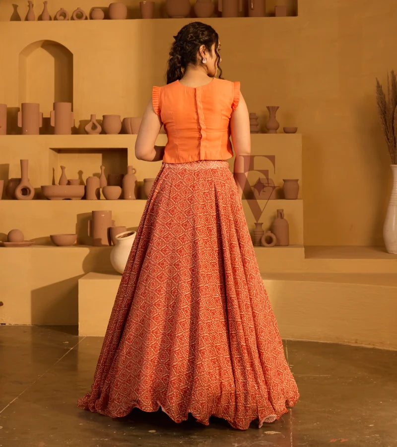 A mild orange flared circle skirt in premium georgette, adorned with printed detailing and self-embroidery with sequins. Paired with a pleated orange crop top in chanderi, featuring a closed neckli...