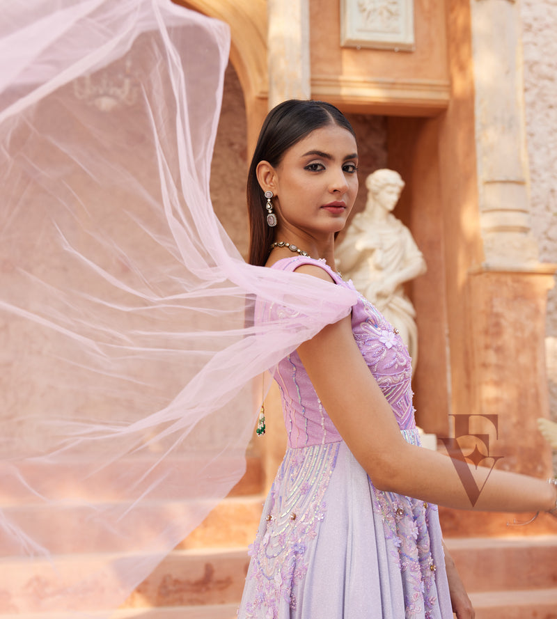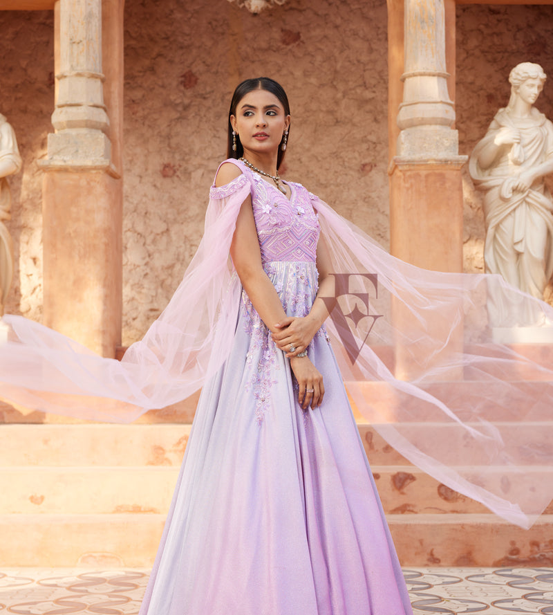 A beautiful pink and lavender ombre gown crafted from premium shimmered lycra fabric. The gown features a flared design with cascading drape sleeves, creating a graceful and dramatic effect. Intric...