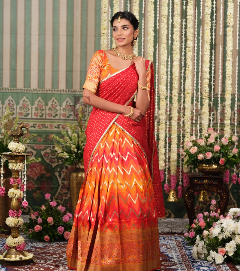 Red and orange Banarasi silk half saree with intricate woven detailing