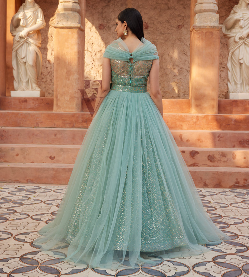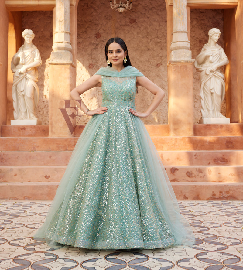 A beautiful seagreen flared gown crafted from premium net fabric, designed with a detachable layer for a versatile look. This gown features exquisite embroidery and is embellished with sequins and ...