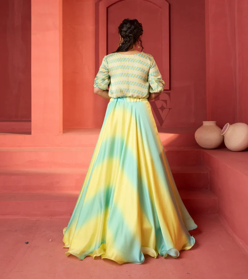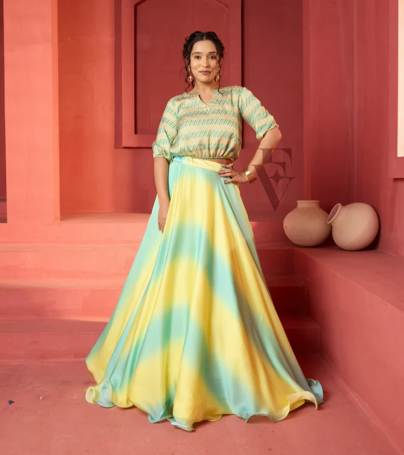 A striking yellow and teal ensemble featuring a flared ombré skirt and a cropped balloon-style blouse. The lightweight georgette satin fabric drapes effortlessly, creating a graceful movement with ...
