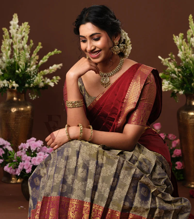 A stunning bluish-green and maroon Kora Tissue silk outfit that looks elegant and sophisticated. The flowy skirt gives you a graceful look, while the matching blouse adds charm. The maroon silky ge...