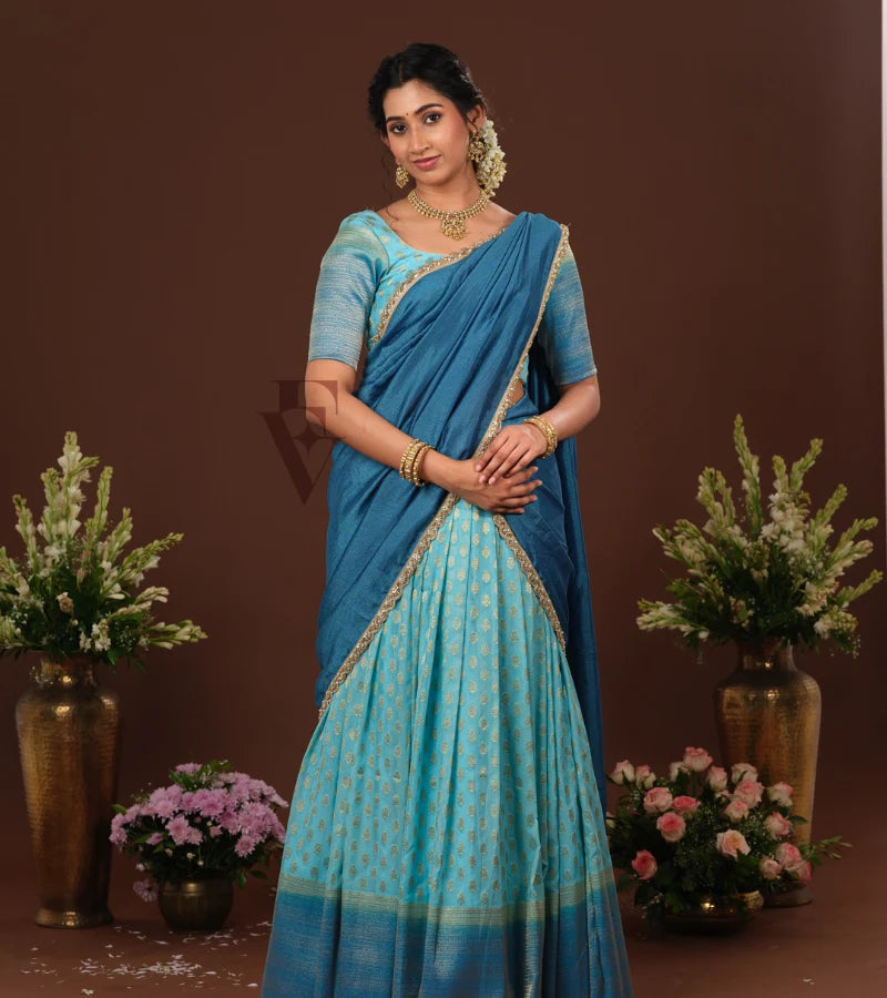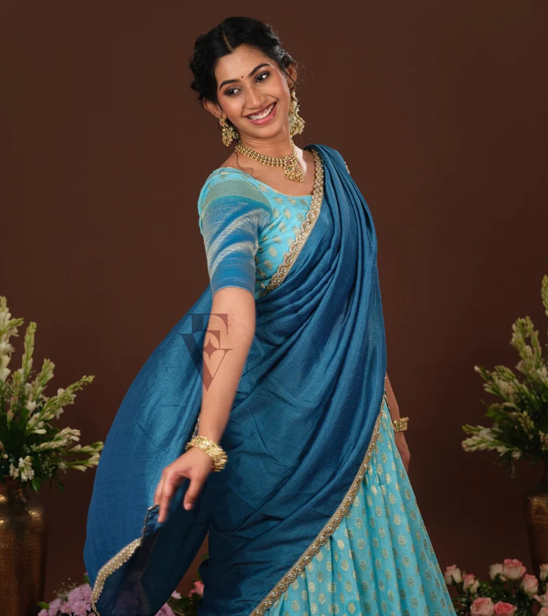 A stunning sea blue and rama blue Banarasi Georgette outfit that radiates elegance and grace. The flowy skirt adds a beautiful touch, and the matching blouse enhances the look. The rama blue silky ...