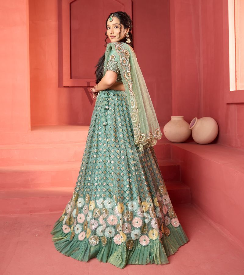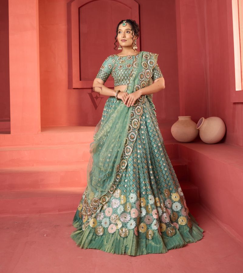 A teal green Lehanga designed with premium net fabric, intricate embroidery, and embellishments like thread, sequins, and mirrors. The princess-cut blouse features a side-open design, and the scall...