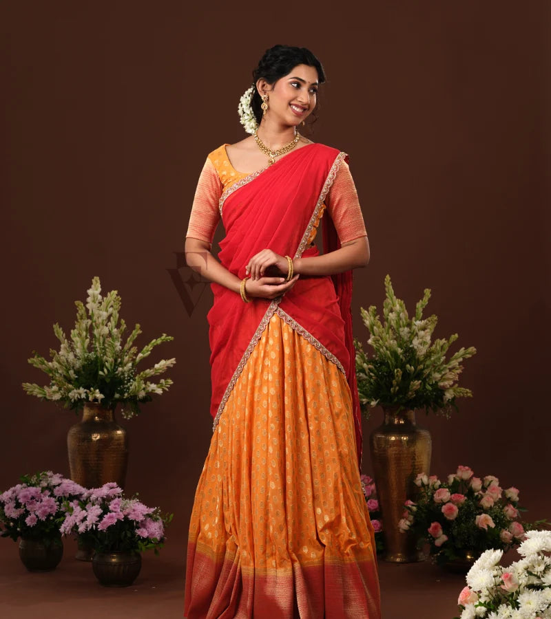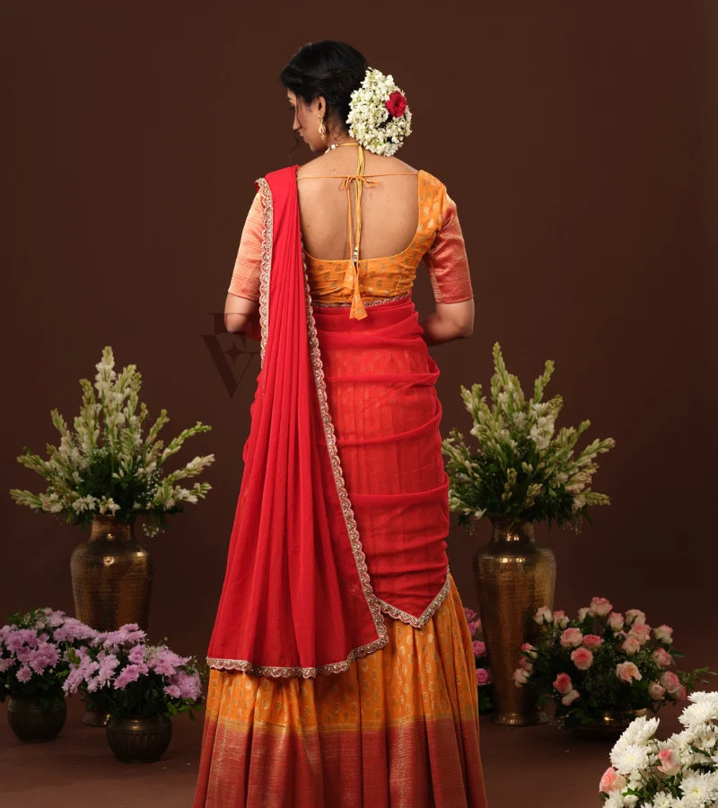 A vibrant orange and red Banarasi Georgette outfit that exudes elegance and festive charm. The flowy skirt adds grace, while the matching blouse creates a coordinated look. The red textured chiffon...
