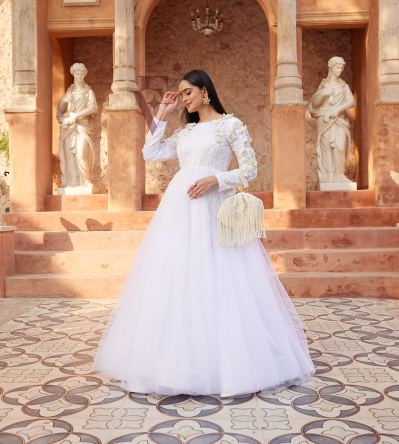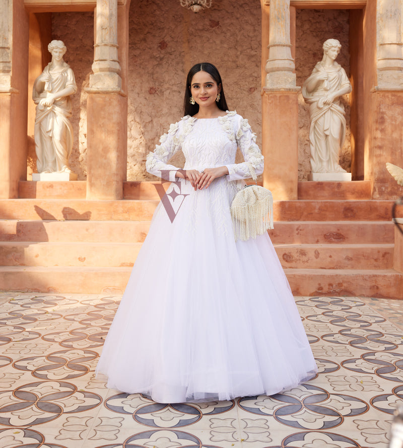 A sophisticated white flared gown crafted from premium soft net fabric, designed to offer elegance and grace. The gown features intricate handwork with wide 3D patterns, creating a unique and luxur...